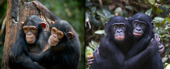 דומים אך מתנהגים שונה מאוד כלפי זרים. בונובו (מימין) ושימפנזים מחובקים | צילום: Wirestock Creators (בונובו) ו-Gerdie Hutomo (שימפנזים), Shutterstock