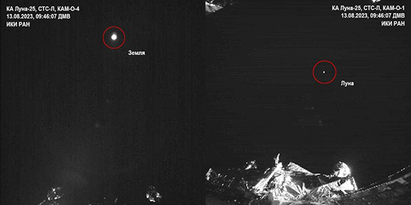 מתקרבים למטרה. כדור הארץ (בעיגול השמאלי) והירח (בעיגול הימני) בצילום של החללית לונה-25 העושה את דרכה לניסיון נחיתה בקוטב הדרומי של הירח | מקור: IKI RAS