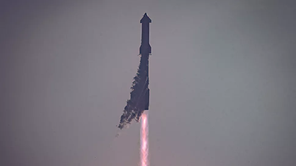 בהתחלה זה עוד נראה טוב. הסטארשיפ על גבי טיל סופר הבי לאחר השיגור מטקסס באפריל השנה, לפני ניסיון ההפרדה הכושל שהסתיים בפיצוץ | צילום:  SpaceX