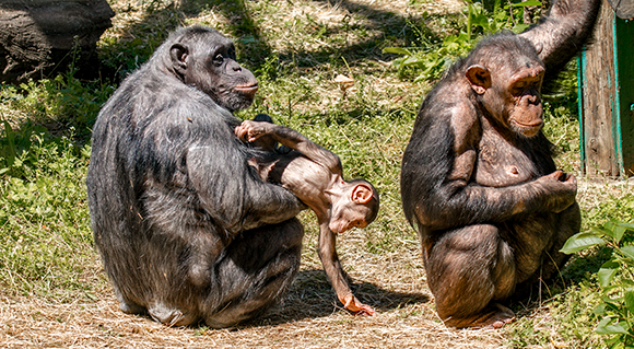 החיים הארוכים לאחר גיל הפוריות עשויים להיות תכונה הייחודית לאוכלוסיית נגוגו. נקבות שימפנזה עם שימפנזה צעיר | Shutterstock, Artex67