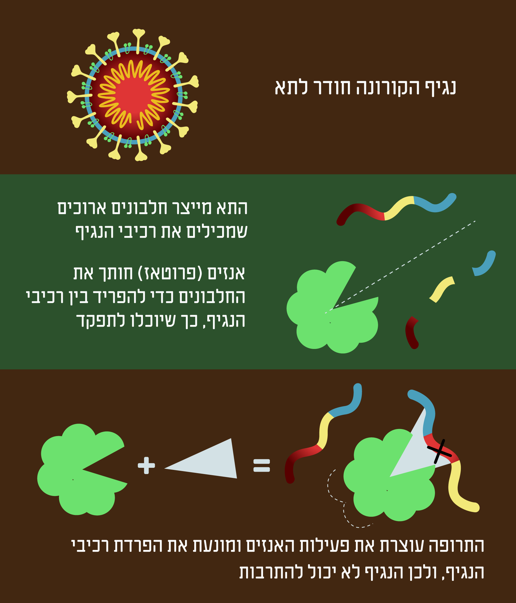 כאשר נגיף הקורונה פולש לתאים שלנו, הוא מחדיר לתוכם את החומר התורשתי שלו ומאלץ את התאים לייצר עותקים רבים שלו, שיפרצו החוצה וידביקו תאים נוספים. תאים שהחומר התורשתי של הנגיף חדר לתוכם מייצרים לפיו את כל החלבונים הנדרשים להרכבת הנגיף; אך במקום לייצר אותם אחד אחד, הם מייצרים אותם כשני חלבונים ארוכים. בשלב הבא, החלבונים הארוכים האלו נחתכים לכמה חלבונים קצרים יותר, שלכל אחד מהם תפקיד אחר במבנה ובפעילות של הנגיף. קצת כמו בדגם להרכבה, כל החלקים נמצאים בהתחלה באותה התבנית ומחוברים זה לזה, ואחר כך מוציאים מהתבנית את החלקים הנחוצים ומנתקים אותם זה מזה כדי לבנות מהם את הדגם השלם.