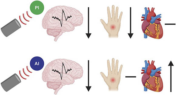 מיקוד גלי האולטרסאונד לחלק האחורי של האינסולה הפחית כאב ולא השפיע על שונות קצב הלב (למעלה), ומיקוד לחלקה הקדמי לא הפחית כאב אך השפיע על שונות קצב הלב. סיכום גרפי של הניסוי | מתוך מאמר המחקר
