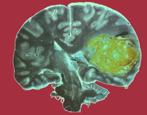גידולי מוח רבים עדיין חשוכי מרפא. גידול גליובלסטומה (ירוק) באונה הרקתית של אדם | צילום: CNRI / SCIENCE PHOTO LIBRARY