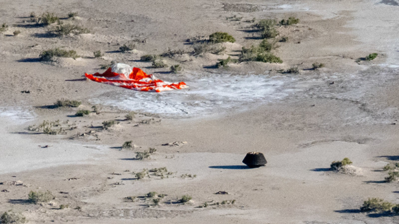 מסע של שבע שנים הסתיים בדמעות של אושר והקלה, אבל המחקר רק מתחיל. הקפסולה עם הדגימה מייד לאחר הנחיתה | צילום: NASA/Keegan Barber