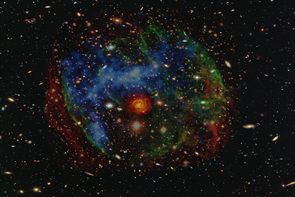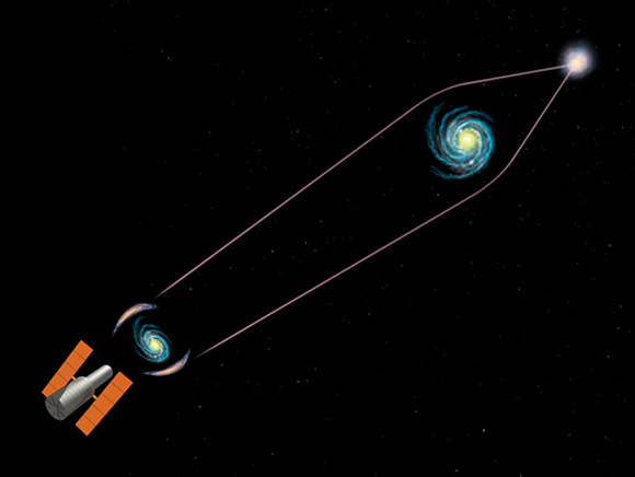 המסה של הצביר כל כך גדולה שהוא יכול לשמש כעדשה ולמקד את האור שמגיע מאחוריו. עקרון העידוש הכבידתי | Julian Baum / Science Photo Library