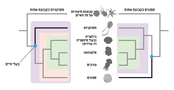 עץ פילוגנטי הוא אילן יוחסין אבולוציוני, שמציג את הקִרבה בין מינים שונים של יצורים חיים. כל נקודה על העץ מסמלת אב קדמון משותף, וכל הסתעפות בין שני ענפים מייצגת התפצלות לשתי קבוצות ביולוגיות. כשאנחנו משרטטים את העץ הפילוגנטי של בעלי החיים, לא ברור איזה קבוצה התפצלה ראשונה מהשאר. בעבר רווחה הסברה שהספוגים התפצלו ראשונים, כי הם פחות מפותחים מבעלי חיים אחרים: אין להם שרירים או מערכת עצבים כמו אצל חיות אחרות. כשהתפתחו שיטות מתקדמות להשוואות גנטיות, חוקרים העריכו שהמסרקניות הקדימו אותם והתפצלו ראשונות. זאת למרות שהן כן מכילות מערכת עצבים פשוטה. אחרים פקפקו בהשוואות הגנטיות, שכן הן מתבססות בין היתר על מוטציות נקודתיות בגֵנים שמורים, שהם גֵנים שהשתנו מעט מאוד במהלך האבולוציה. מוטציות נקודתיות יכולות לקרות כמה פעמים במהלך מיליוני שנים, ולכן קשה לחזות איזו מהן מצביעה על קִרבה ואיזו התפתחה במקרה בשני בעלי חיים שונים.