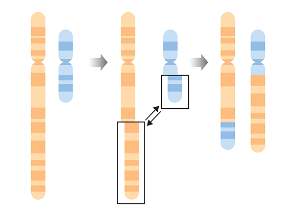 החוקרים התמקדו גדולים במבנה הכרומוזומים, בהם מקטעים שלמים של DNA עברו מכרומוזום אחד לאחר. אילוסטרציה של מוטציה כרומוזומלית בה כרומוזומים מחליפים ביניהם מקטעים | Shutterstock, Ali DM