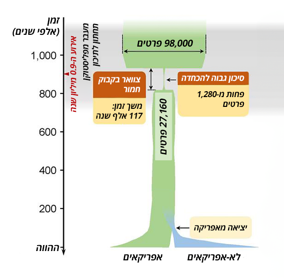 האוכלוסייה מנתה כ-1280 אנשים בממוצע לאורך כמאה אלף שנים. תיאור גרפי של צוואר הבקבוק לפני כ-900 אלף שנים | מקור: Science