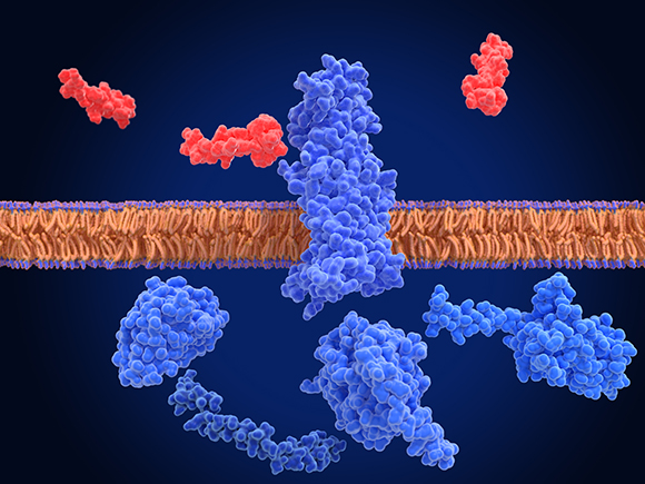 GLP-1 הוא הורמון שמעביר תחושת שובע למוח אחרי הארוחה ומעודד הכנסה של הסוכר מהדם לתאים. הקולטן ל-GLP-1 בקרום התא (כחול) והתרופה סמגלוטייד (אדום) | Juan Gaertner, Shutterstock