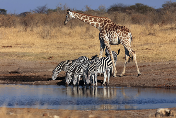 במחקר ציידו שש זברות בקולר עם מצלמת וידאו ועקבו אחר תנועתן. זברות וג'ירפה שותות ממאגר המים | Karel Bartik, Shutterstock