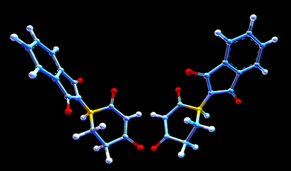מולקולת תלידומיד בעלת כיראליות ימנית עם פעילות נוגדת בחילות, ותלידומיד שמאלי, שגרם למומים בעוברים. שני אננטיומרים של מולקולת תלידומיד, מרכז המולקולה בצהוב | Alfred Pasieka / Science Photo Library