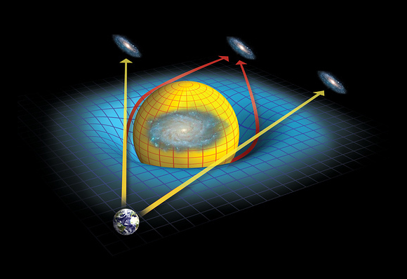 תופעת העידוש הכבידתי מספקת לנו תצפית עקיפה בגופים רחוקים מאוד, שלפעמים איננו יכולים לצפות בהם ישירות. הדגמה של עידוש כבידתי, בה בשל הכבידה של הגלקסיה הגדולה (בעיגול הצהוב), אנחנו יכולים לצפות בגלקסיה שמאחוריה | Tim Brown / Science Photo Library
