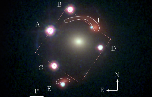 הצופים בכדור הארץ רואים בסופו של דבר שש "תמונות" שונות, שנוצרו עקב עיקום האור משתי עדשות. תמונה שמראה את שש התמונות, מסומנות מ-A ל-F | מתוך המאמר Dux et al., 2024