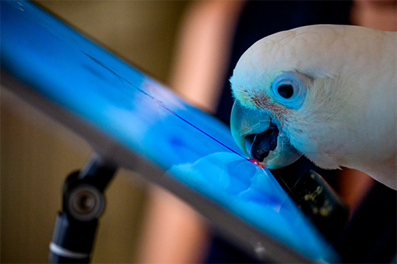 בעלי החיים החברתיים בחרו להתקשר זה לזה. תוכי מתקשר לתוכי אחר באמצעות אייפד | צילום: Matthew Modoono/Northeastern University