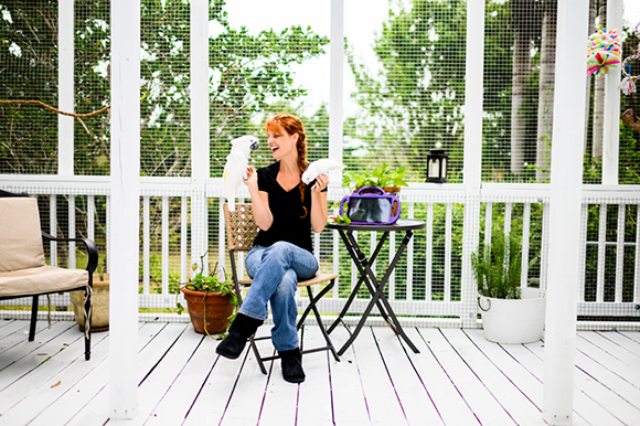 השיחות היטיבו עם התוכים ועם הבעלים. ג'ניפר קונייה וקקדו | צילום: Matthew Modoono/Northeastern University