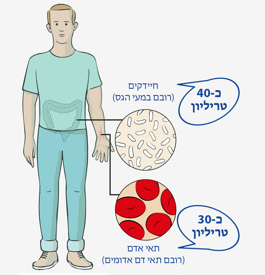 חיידקים הם אורחי קבע בגוף שלנו, ומתקיימים באזורים רבים בתוך הגוף ועליו. בשנים האחרונות מתברר כי חלקם בגרימת מחלות והשפעתם על תפקודנו התקין גדולים בהרבה ממה שסברו עד כה. אבל כמה חיידקים יש בגוף האדם? ומה היחס המספרי שלהם לעומת תאי הגוף? על השאלות האלה המדע והרפואה התקשו מאוד להשיב עד כה והסתפקו בהערכות גסות למדי. כעת, חוקרים במכון ויצמן למדע שופכים אור חדש על הסוגיה, ומציגים נתונים שונים מאוד מהמקובל.