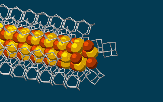 יחידות יהלומיות עם אטומי גופרית, המתחברות כמו לגו. דגם של הננו-חוט | איור: SLAC, אוניברסיטת סטנפורד