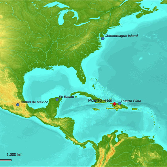 ספינות מספרד שטו לאורך חופי אמריקה הצפונית במהלך המאה ה-16, וייתכן שמקורם של סוסי הצ'ינקוטיג בספינה טבועה שכזו. האי אסאטיג (צ'ינקוטיג במפה) – משכנם של סוסי פוני צ'ינקוטיג, ופוארטו ריאל בהיספניולה – שבו התגלתה שן הסוס | מקור: Delsol et al., CC-BY