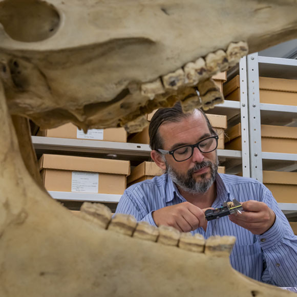שן שקוטלגה כשן פרה התבררה כשן סוס. ניקולא דלסול בוחן את שן הסוס על רקע גולגולת סוס | מקור: Florida Museum, Jeff Gage