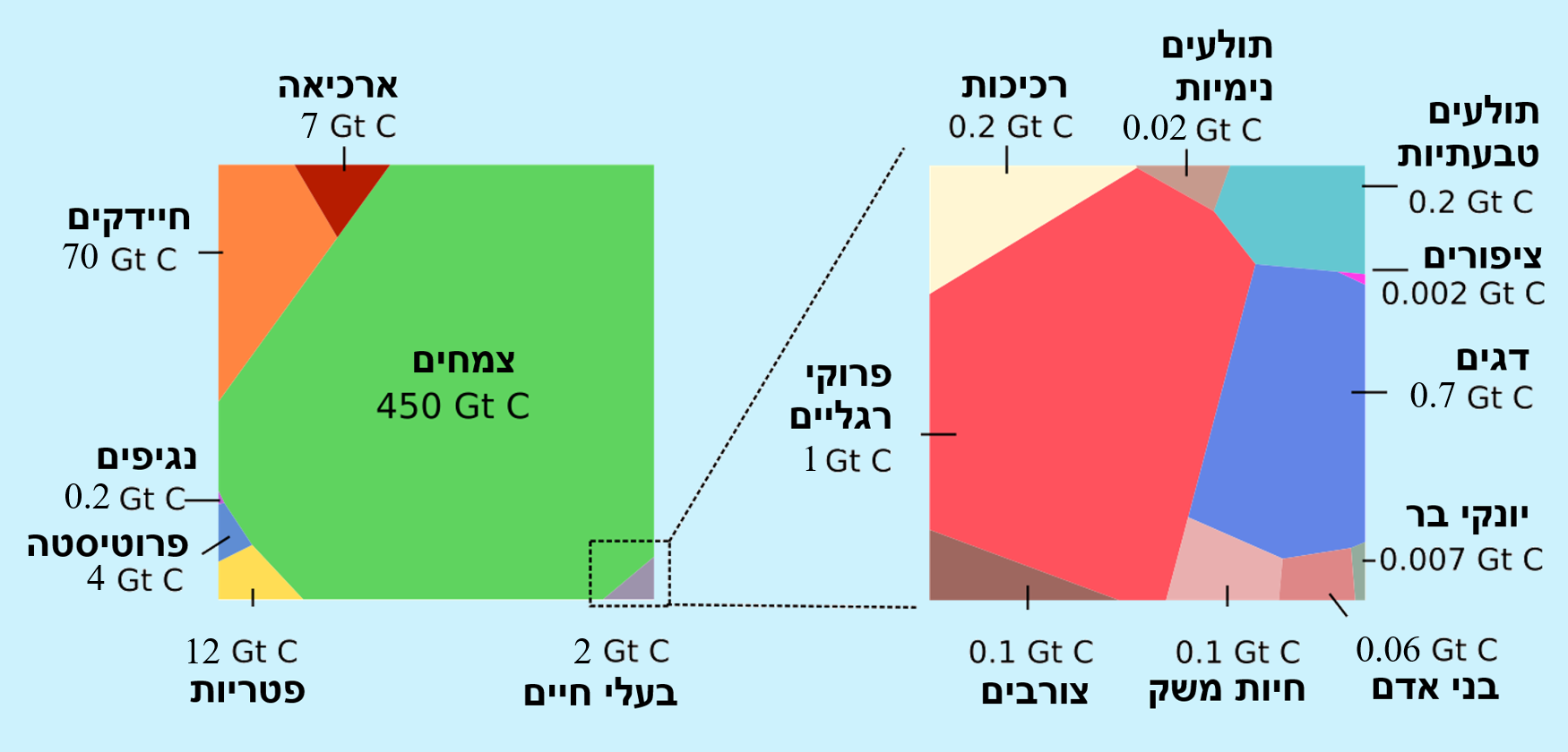 כאמור, בר-און ועמיתיו העריכו את משקל הפחמן, לא את המשקל האמיתי של היצורים השונים. הנתון הזה קרוב יחסית למשקל היבש של רוב הצמחים ובעלי החיים, בלי משקל המים שהם מכילים. הם מצאו שהמשקל הכולל של פחמן ביצורים חיים הוא כ-550 ג'יגה-טון (550 מיליארד טונות). חלק הארי מתוך המשקל הזה, כ-450 ג'יגה-טון, משויך לצמחים. הפחמן שמקורו בחיידקים שוקל כ-70 ג'יגה-טון, ואפילו הפטריות שוקלות כ-12 ג'יגה-טון. הפחמן בבעלי החיים כולם, לעומת זאת, שוקל 2 ג'יגה טון בלבד.