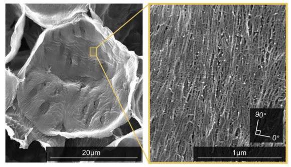 תמונת מיקרוסקופ של תאי הדופן מגלה כיווניות רבה בסידורם. משמאל: פני השטח של דופן תא בודד, מימין: הגדלה נוספת מראה את סיבי התאית מסודרים בכיוון מסוים | מתוך מאמר המחקר