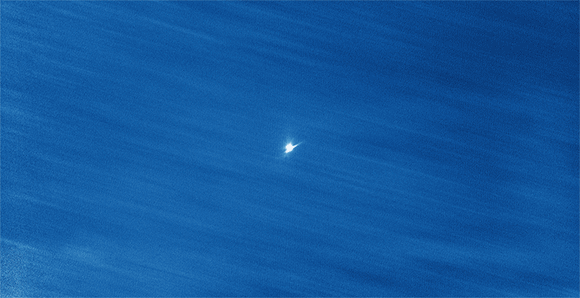 מערכת האסטרואיד דידימוס ושובל ההתנגשות בתצפית מכדור הארץ. הפסים האלכסוניים הם כוכבים שצולמו בחשיפה ממושכת | צילום: University of Canterbury Ōtehīwai Mt John Observatory/UCNZ