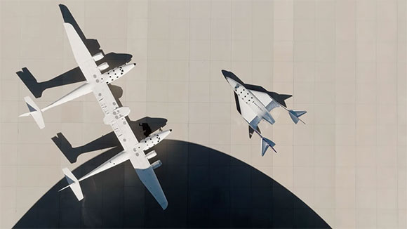 שוב ביחד, אחרי הפוגה ארוכה. החללית Unity (מימין) והמטוס “ספינת האם איב” בנמל החלל של וירג’ין בניו מקסיקו, השבוע | צילום: Spaceport America