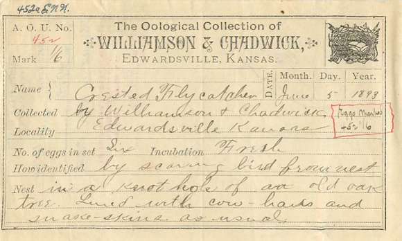 מידע על קן של Myiarchus crinitus, ממשפחת הטירניים, שכולל "עור נחש, כרגיל". כרטיס תיעוד קינים משנת 1893| מקור: Western Foundation of Vertebrate Zoology