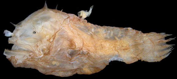 טפיל מיני. זכר באורך 6 מילימטר מהמין Photocorynus spiniceps מאוחה לגבה של נקבה באורך 46 מ"מ | צילום: Theodore W. Pietsch