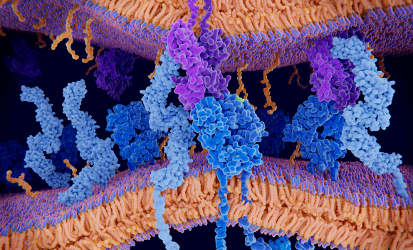 הבחנה בין עצמי לזר. קולטנים של תא T (כחול) נקשרים לחלבונים של מערכת MHC (סגול) | איור: JUAN GAERTNER / SCIENCE PHOTO LIBRARY