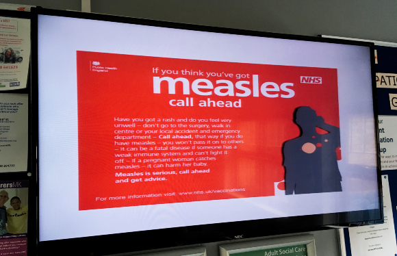במערב אירופה בריטניה היא המוקד המדאיג. אזהרה למטופלים מפני חצבת במרפאה ציבורית בלונדון, 2018 | צילום: David Cardinez, Shutterstock