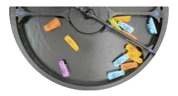 מערכת הניסוי. החלקיקים הצבעוניים הם רובוטים קטנים שמדמים מערכות פעילות בטבע. את המחיצה השחורה אפשר להתאים למיקום החלקיקים | מתוך מאמר המחקר