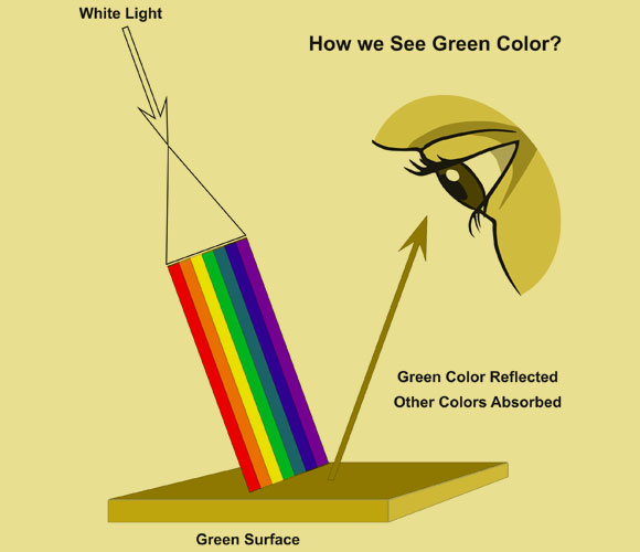 איך אנו רואים צבעים? משטח ירוק בולע את רוב הצבעים ומחזיר בעיקר ירוק | איור: Shutterstock
