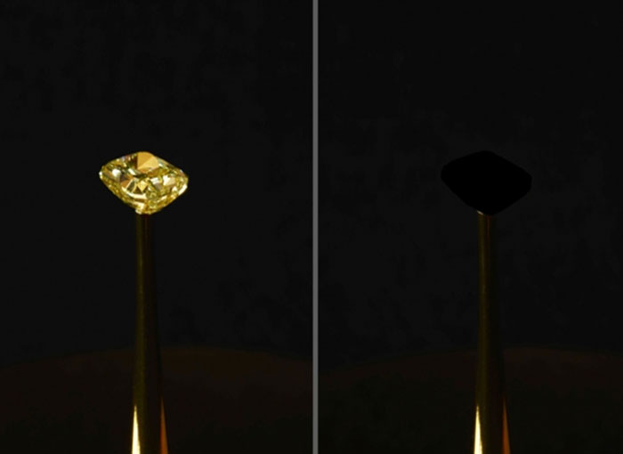 שחור יותר מהרקע. יהלום רגיל (משמאל) ובציפוי בולע אור (מימין) | צילום: Diemut Strebe, MIT