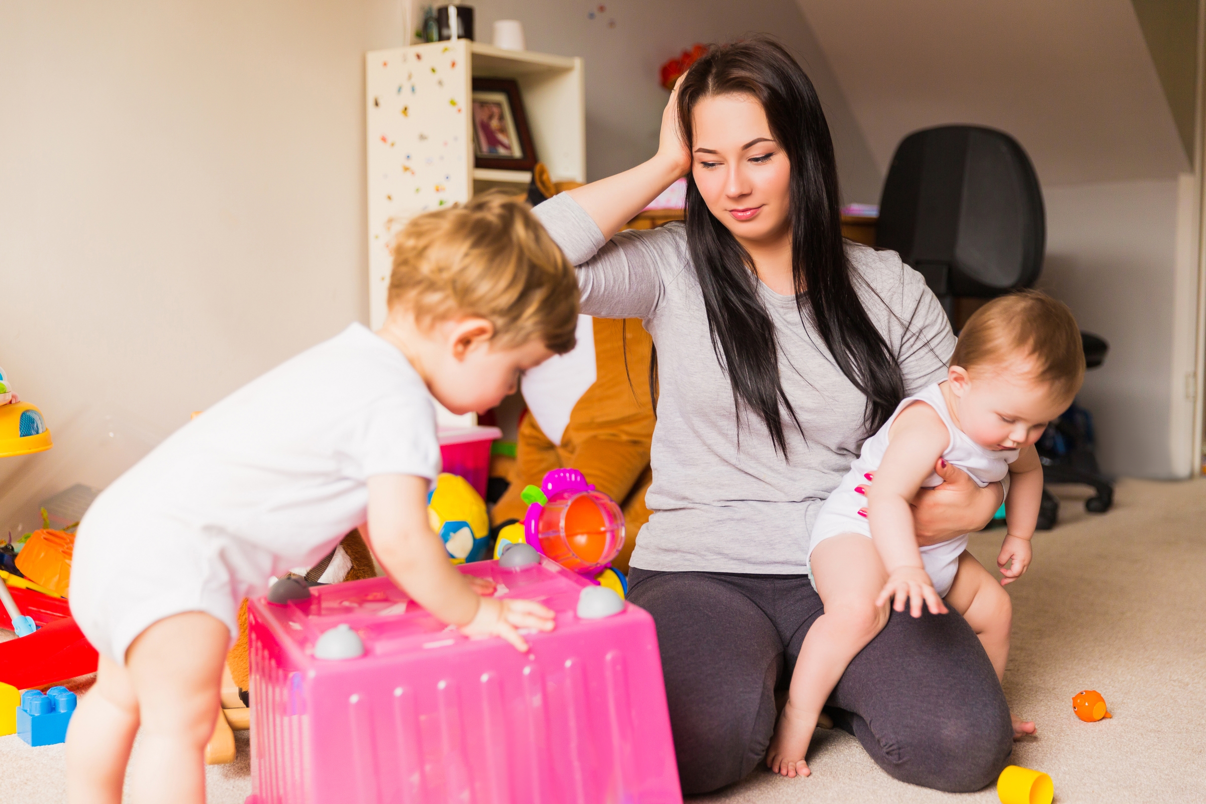 במערב, במקרים רבים אדם אחד אחראי על הטיפול בילד בשנות חייו הראשונות, לרוב זו האמא. אמא בבית עם שני פעוטות | צילום: Myroslava Malovana, Shutterstock