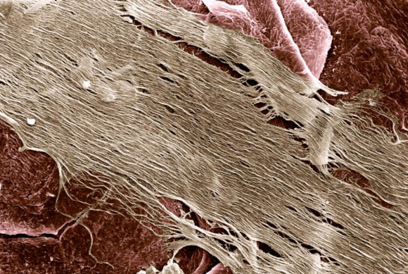 שתלי עור בנויים כטלאים דו-ממדיים שלא מכסים היטב אזורים עם מבנה תלת-ממדי מורכב. צילום מיקרוסקופ אלקטרונים של שתל עור על כוויה | מקור: David Gregory & Debbie Marshall, CC BY 4.0