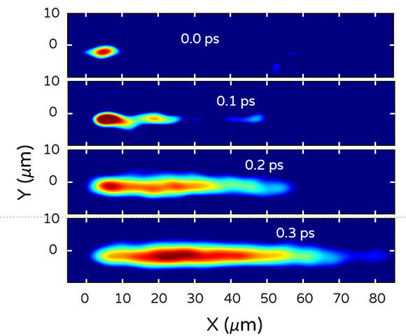 במחקר התחקו החוקרים אחרי התנועה של פולריטון – קוואזי חלקיק של אטום מעורר ופוטון – דרך חומר. הגיף מראה את מיקומו של הפולריטון לאורך זמן | ד"ר טל שוורץ