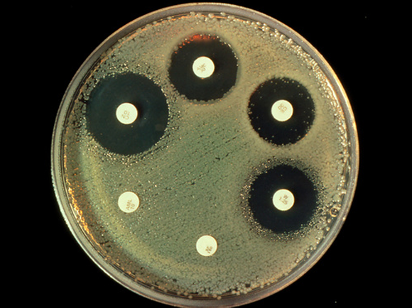 אחת הבעיות החמורות של ימינו. חיידקי E. coli עמידים בפני שני סוגים של אנטיביוטיקה (העיגולים הלבנים התחתונים) אך רגישים לארבעת הסוגים האחרים, שסביבם יש אזור נקי מחיידקים | צילום: JOHN DURHAM / SCIENCE PHOTO LIBRARY