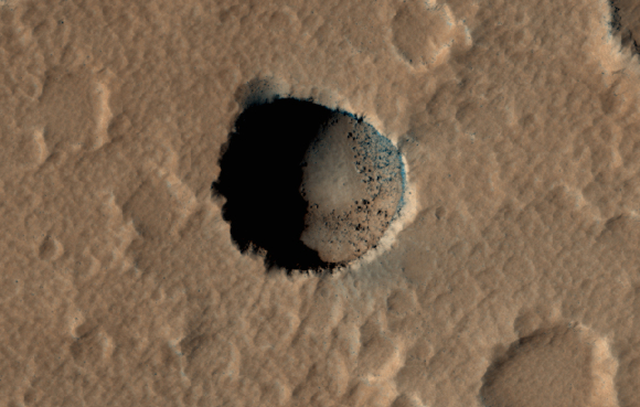 האם זה אחד התאומים המאדימיים של הג'ובות ברמת הגולן? צילום לוויין של שקע על מאדים שנוצר כנראה עקב קריסת קרקע | צילום: NASA/JPL/University of Arizona