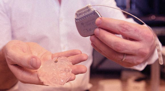הטיפול עדיין בראשיתו. המשדר החכם לצד אלקטרודות בדגם סיליקון של מוח פרימאט | צילום: Alain Herzog / EPFL