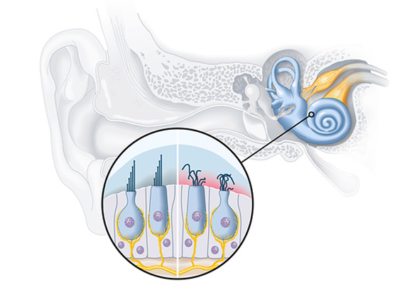 הפגם נובע כנראה מפעילות לקויה של תאי השערה בשבלול האוזן או של סיבי העצב המגיעים משם למרכזי השמיעה במוח. אילוסטרציה של מבנה שבלול האוזן, תאי השערה במצב תקין (משמאל) ופגום, וסיבי העצב | Axel Kock / Science Photo Library