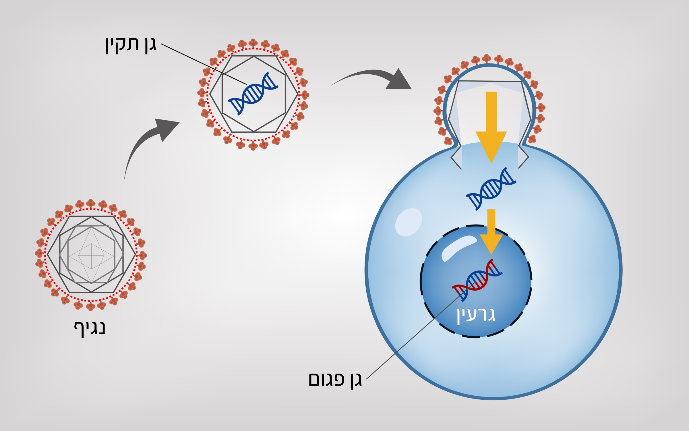 בריפוי גני משתמשים בנגיף כדי להחדיר גרסה בריאה של הגֵן לתאים באזור המטרה. אילוסטרציה של ריפוי גני | Shutterstock, Science Project 101