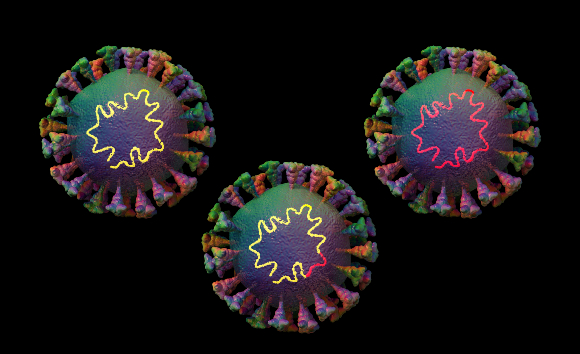 ייתכן שהנגיפים נוצרים אצל חולים בעלי דיכוי חיסוני. המחשה של מעבר גנים בין נגיפי קורונה | איור: RUSSELL KIGHTLEY / SCIENCE PHOTO LIBRARY
