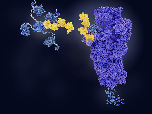 כשחלבונים נשחקים, ניזוקים או שאינם נחוצים עוד, הם מושלכים לפח האשפה התאי – הפרוֹטֵאָזום. אילוסטרציה של מבנה הפרוטאזום (מימין), כאשר הוא מפרק חלבון לחלקיו הקטנים (מימין למטה) | Juan Gaertner / Science Photo Library
