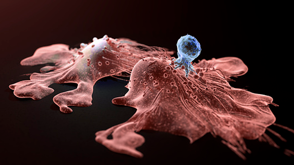התאים הלבנים בודקים את הביוגרפיות התאיות שהרכיבו הפרוטאזומים ומוצגות על מעטפת התא, ומחפשים בהן סימנים מחשידים. תא מערכת החיסון (בכחול) נצמד לאנטיגנים על תא סרטני | Thom Leach / Science Photo Library
