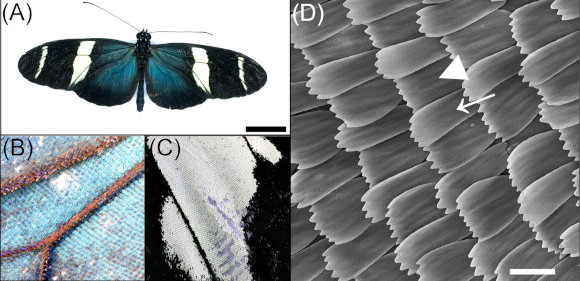 לקשקשים הבוהקים והעמומים מבנה דומה. פרפר הליקוניוס שׂרה (A), קשקשים בוהקים בכחול (B) וקשקשים עמומים שחורים ולבנים, צילום מיקרוסקופ אלקטרונים של הקשקשים (D). מקור: Lloyd, V.J. et al. Nat Commun (2024)
