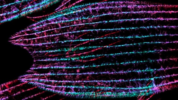הסיבים הם מעין "שבלונות" שעליהן נוצרים המבנים שמעניקים לקשקש צבעים פיזיקליים. סיבי אקטין בקשקש מתפתח של פרפר | מקור: Lloyd, V.J. et al. Nat Commun (2024)