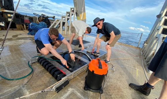 אי אפשר לקבוע בינתיים שמדובר בטכנולוגיה חוצנית. לייב (עם הכובע) ועמיתיו במהלך איסוף הדגימות מהמגנט של הספינה | צילום באדיבות אבי לייב, אוניברסיטת הרווארד