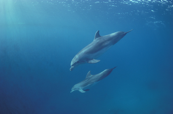 אמהות דולפינן מצוי מתקשרות עם הגורים שלהן ב"הורית". אמא וגור | צילום: Jeff Rotman / Science Photo Library