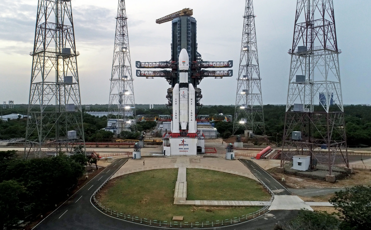 אמורה להיות החללית הראשונה שתשלים נחיתה רכה סמוך לקוטב של הירח. משימת צ'נדריאן 3 על גבי טיל LVM3 M4 על כן השיגור | צילום: סוכנות החלל של הודו, ISRO, ויקיפדיה